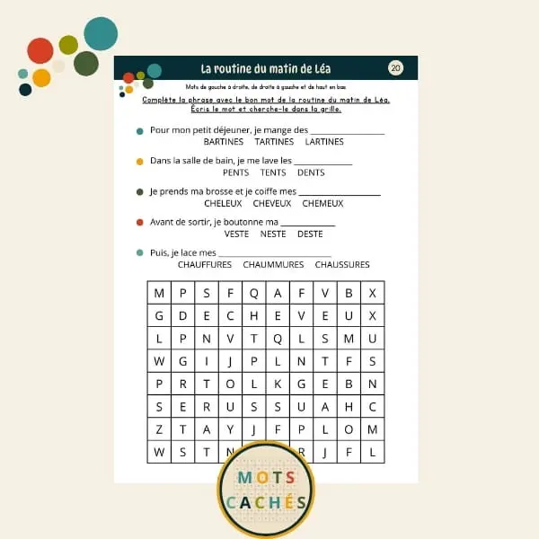 • 1 grille défi « La routine du matin de Léa » avec 5 mots à écrire et à chercher dans la grille (mots de gauche à droite, de droite à gauche, de haut en bas et de bas en haut).