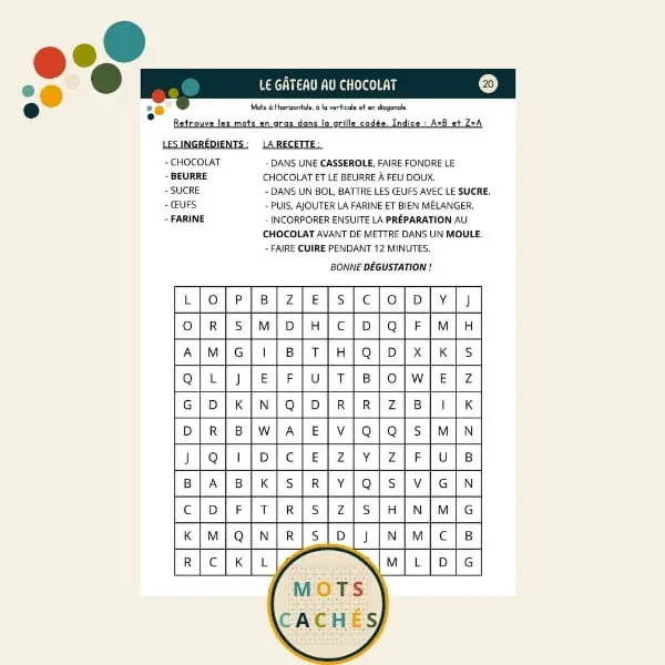 - 1 grille défi « Le gâteau au chocolat » avec 11 mots à trouver dans une grille codée (A=B).