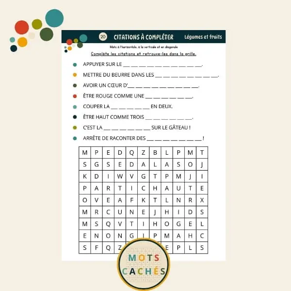 • 1 grille défi « Citations à compléter » avec 8 mots à écrire et à trouver, sur le thème du jardin, des fruits et des légumes  (mots à l’horizontale, à la verticale et en diagonale).